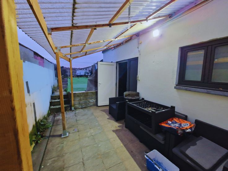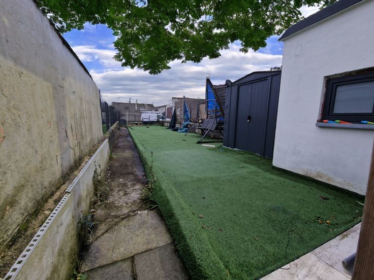 Les extérieurs : coin terrasse couvert, pièce buanderie/chaufferie, jardin avec pelouse synthétique pour un entretien aisé.