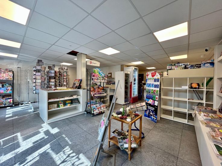 Handelsruimte/kantoor in recente residentie (bwj 2018) die momenteel ingericht is als een krantenwinkel en die bestaat uit een handelsruimte van +/-65 m2 en een opslagruimte/ garage die ingericht is met keuken en toilet.