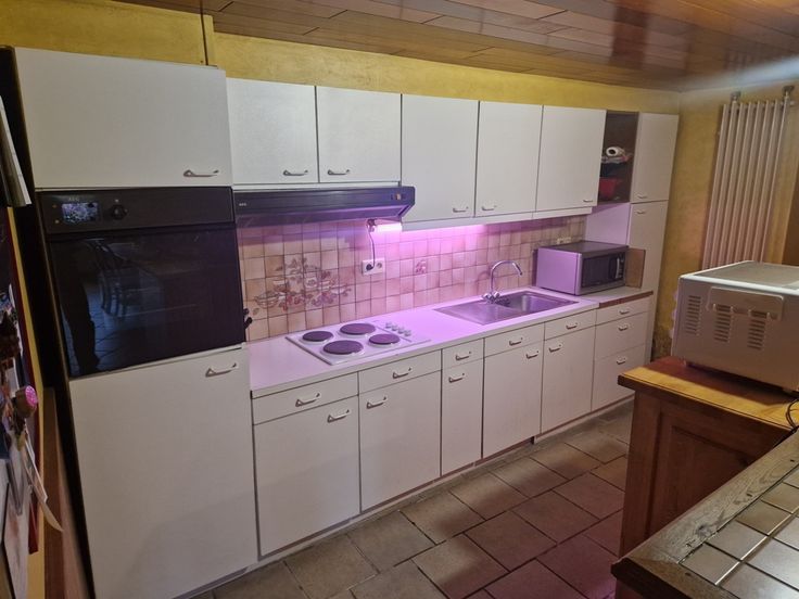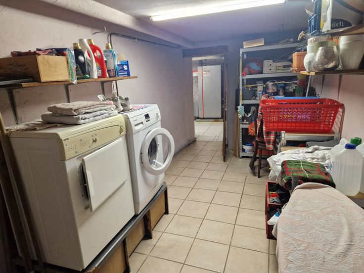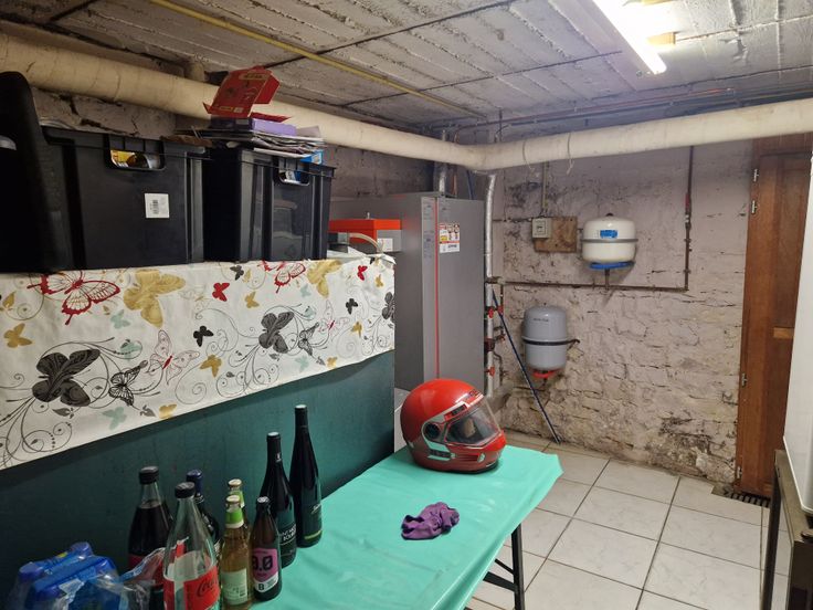 Elle se compose au rez-de-chaussée de la salle à manger (ancien évier en pierre) ouverte sur la cuisine, du salon équipé d’un poêle à bois, d’une buanderie et de l’espace chaufferie.