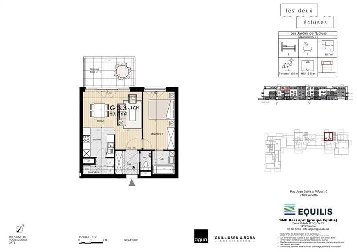 Ontdek dit appartement (ref G.3.3 ) in zijn idyllische omgeving aan de poort van Waals-Brabant (5' van Nijvel) en op een boogscheut van 5 grote wegen. De urbanisatie Les Deux Ecluses heeft het allemaal: gelegen in een groene oase tussen het kanaal en de wandelpaden, op loopafstand van winkels en vervoersverbindingen. Dit lichte appartement met 1 slaapkamer is een uitstekende investering en heeft ook een groot terras van 10,6 m². Alle voorzieningen (keuken, elektriciteit, badkamers, tegels en parketvloer) zijn in de prijs inbegrepen, behalve het schilderwerk. Uitstekende isolatie, liften, maximaal 3 verdiepingen, parkeerkelder en kelders (tegen betaling). Contacteer ons voor meer informatie Les Viviers new@lesviviers.be of 010 24 2