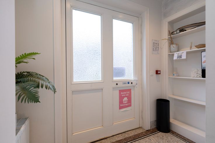 Inkom met toiletten, keuken en trap naar privé plaatsen.