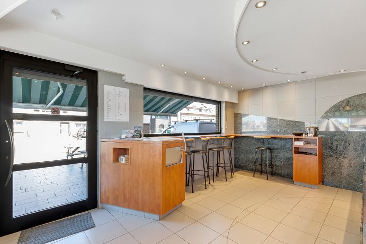 Het handelsgelijkvloers wordt momenteel uitgebaat als frituur. U beschikt hier vooraan over een handelsruimte, met ruim terras, en achterliggend een ingerichte keuken, ook voorzien van koelruimte. Verder op het gelijkvloers beschikt u nog over extra berging en een aparte bureauruimte. De bovenliggende woonst is bereikbaar via een aparte inkom. Hier beschikt u over een ruime leefruimte met veel lichtinval door de grote raampartijen. Deze kunt u inrichten met een gezellige zithoek, uitgerust met haard, en een aparte eetplaats. Op de eerste verdieping bevindt zich verder nog een ingerichte keuken. De nachthal op de tweede verdieping geeft ons nog toegang tot 2 slaapkamers en de badkamer, uitgerust met dubbele lavabo, toilet en ligbad. U beschikt over voldoende parkeermogelijkheden op de ruime parking. Hier bevindt zich ook nog een aparte garagebox.