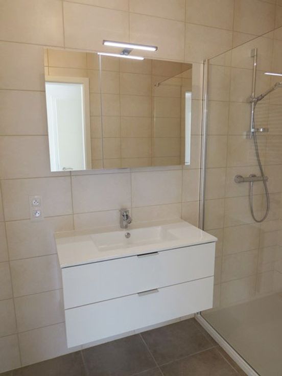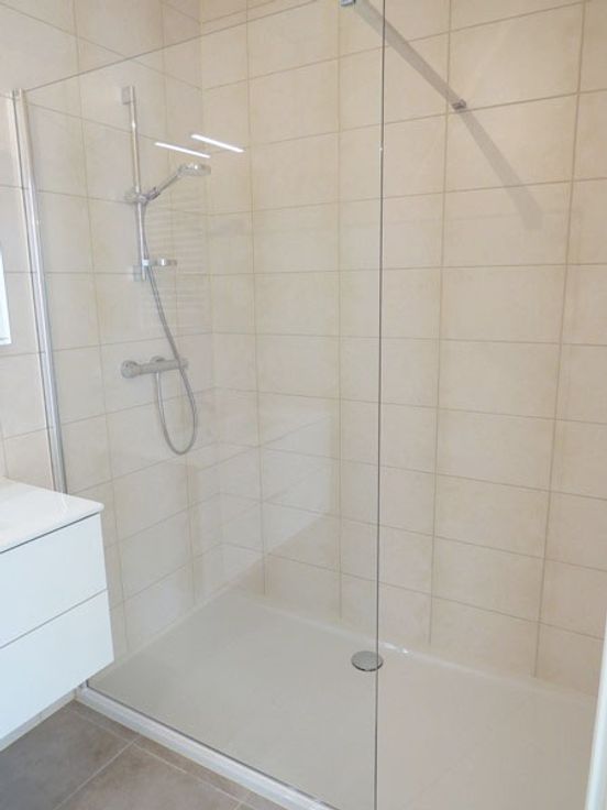 Composition (+/- 87m²) : grand hall d'entrée, buanderie (emplacement machines et pompe double flux), sdd (meuble lavabo et; douche italienne), wc séparé, 2 chambres de 8 et 12m² dont une avec dressing intégré, spacieux et lumineux living de 33m² avec cuisine équipée ouverte et accès à la terrasse bien exposée.