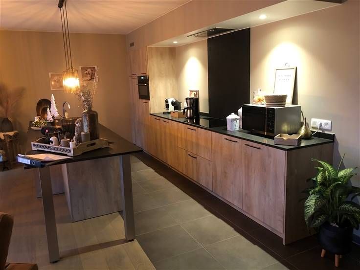Een gezellige inkom, een afzonderlijk toilet, een open keuken uitgerust met hoogwaardige materialen en toestellen, een zeer ruime leefruimte met veel natuurlijk licht dankzij de grote ramen die uitkijken op het grote terras.