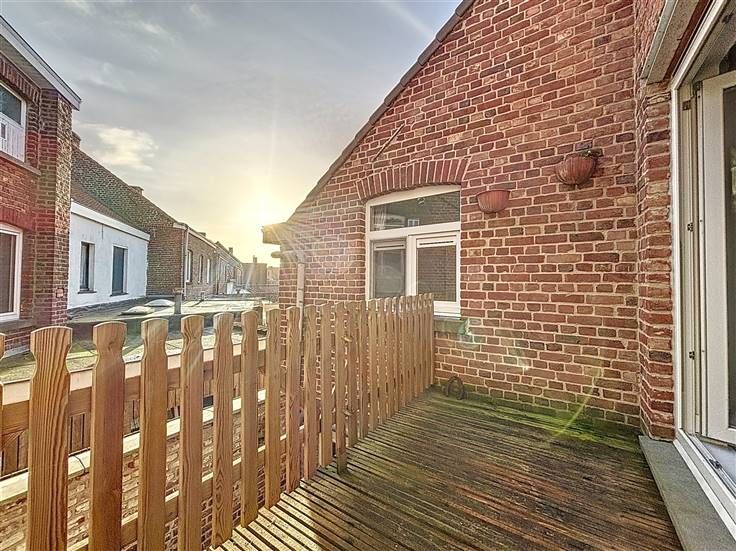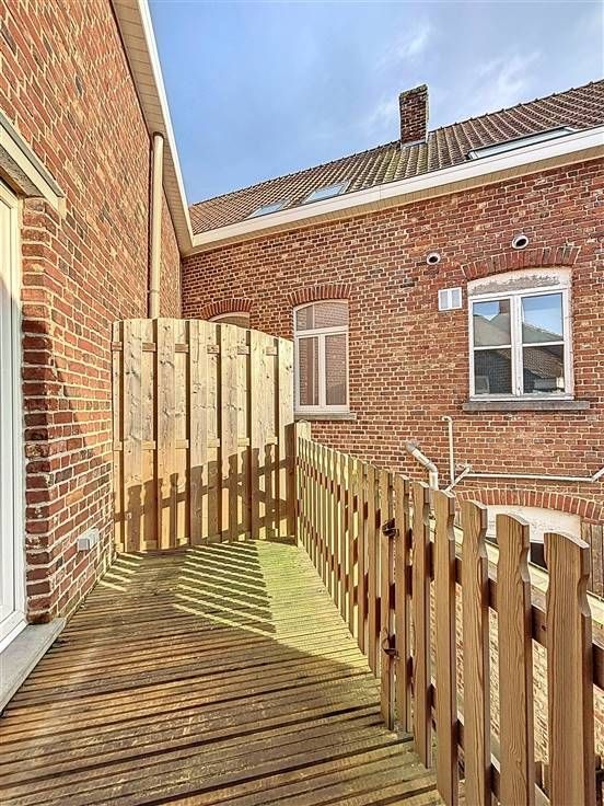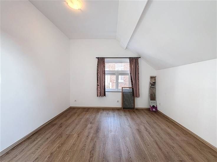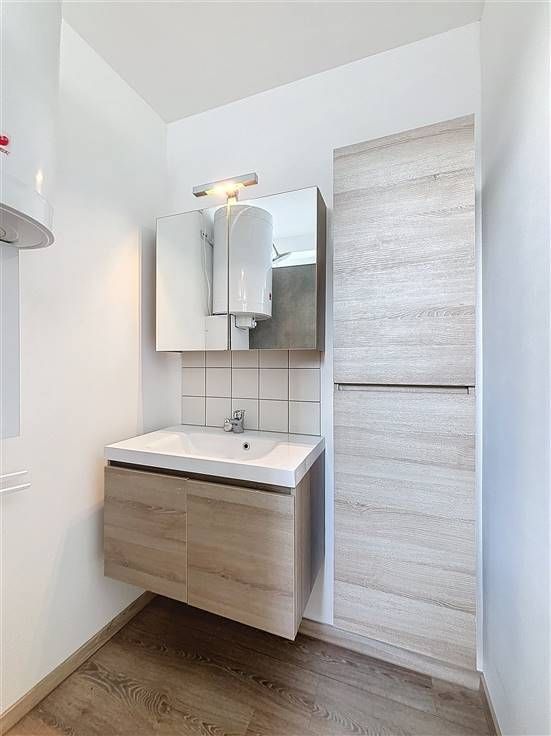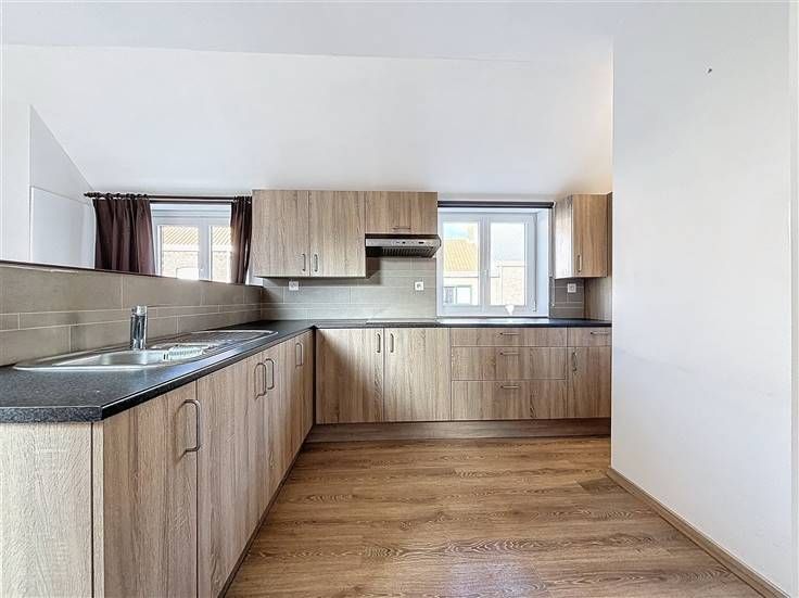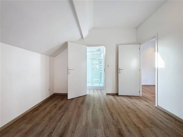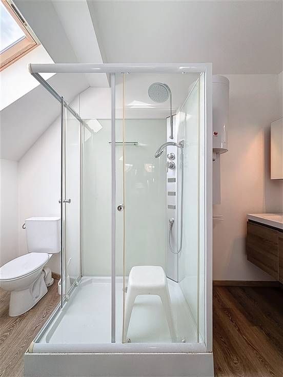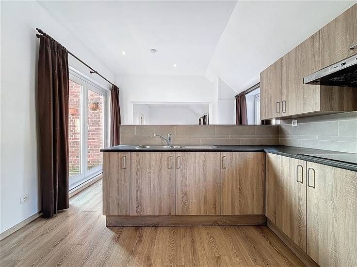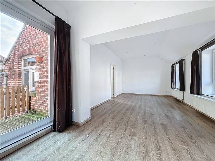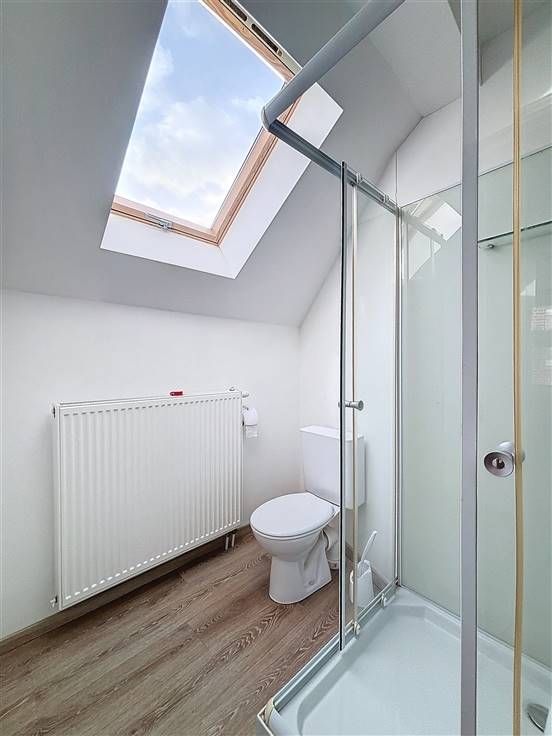 1e verdieping: leefruimte met open keuken en zonnig terras, slaapkamer met aansluitend de badkamer voorzien van douche, lavabomeubel en toilet.