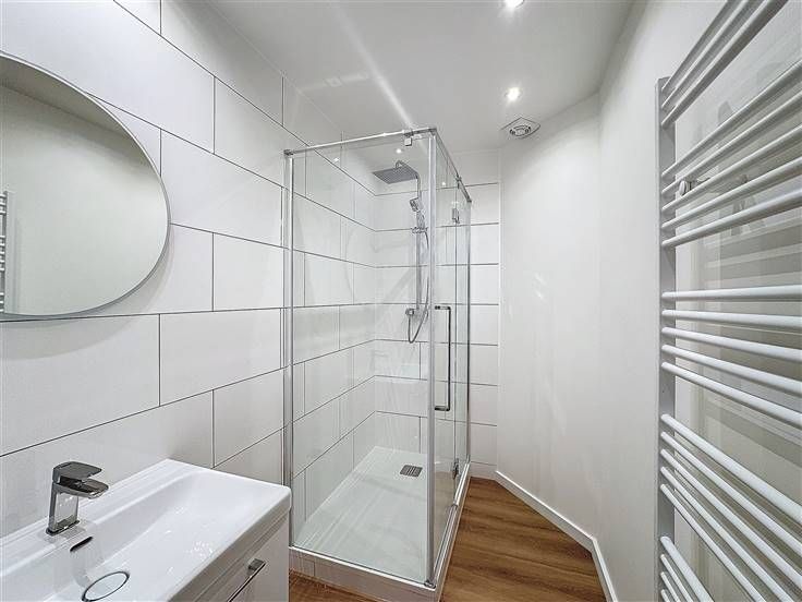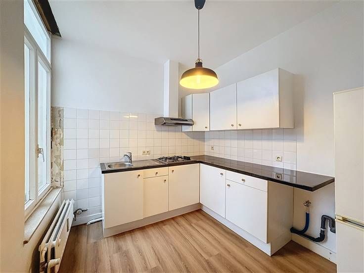 Een inkomhal, een grote lichte woonkamer van +/- 24m², een half ingerichte keuken (koelkast, gasfornuis en afzuigkap), 2 mooie slaapkamers van +/- 15m² en +/- 14m², een douchekamer en een apart toilet - Dubbele beglazing, telefoon, kelder - Bijkomende kosten: €150/maand (warm/koud water, verwarming en onderhoud van gemeenschappelijke ruimtes) - Beschikbaar per direct