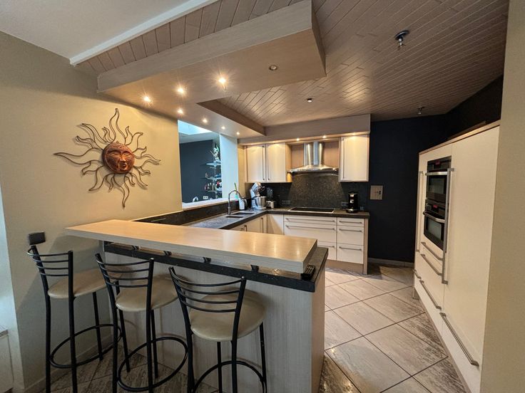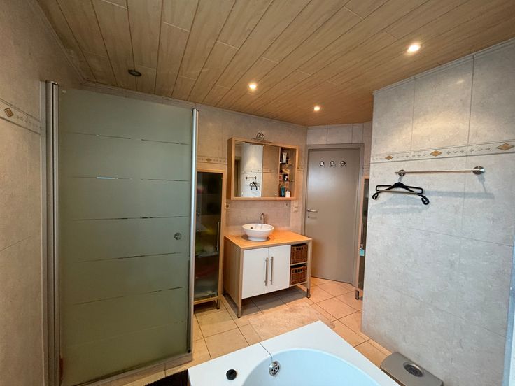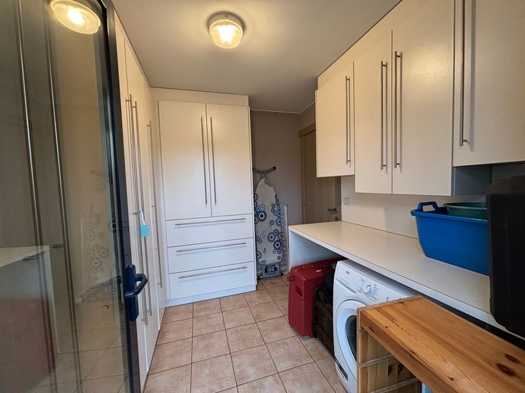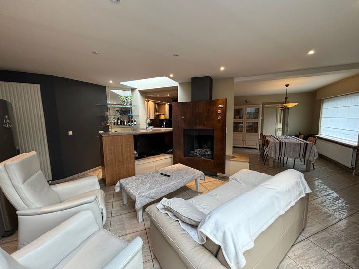 De woning bestaat uit: een inkomhal, waar u via een brede glazen deur een royale living met eetkamer en gezellige stijlvolle openhaard vindt alsook een open volledig ingerichte keuken, aansluitend een ruime ingerichte wasplaats / berging. Rechts van de inkomhall vindt u een apart gastentoilet, een toegang tot bureau en aangehecht een stockageruimte. Op de eerste verdieping: 3 riante slaapkamers, waarvan 1 met dressing. Badkamer met afzonderlijk ligbad en douchecel, badkamermeubel, toilet. Via houten telescoopladder bereikt je de zolder.