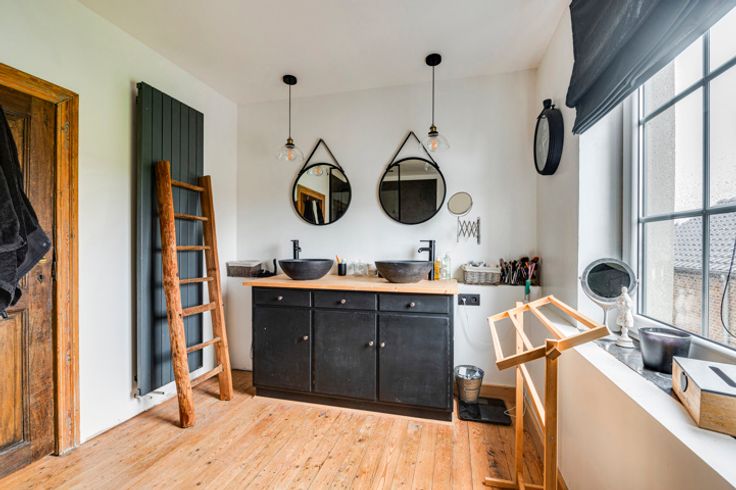 1ste verdieping: hal met leeshoek, 4 slaapkamers (waarvan één met ingebouwde dressing) en 2 badkamers (grote Italiaanse douche, wastafels en WC).