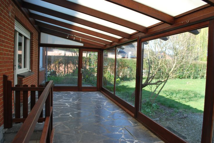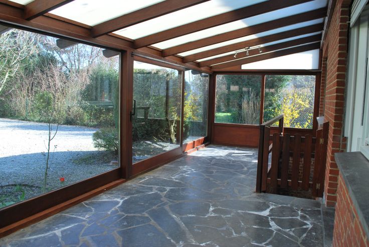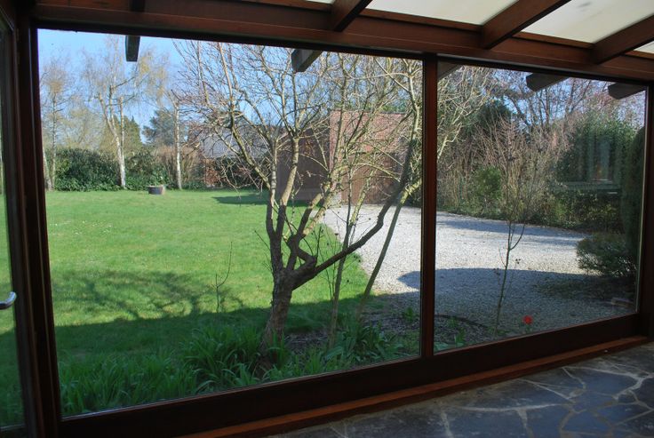 Grande véranda entièrement vitrée donnant sur un grand jardin.