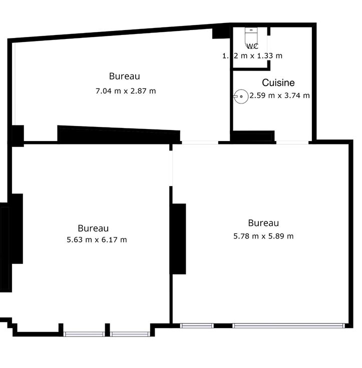 Gelegen op de begane grond van een gebouw met karakter, het bestaat uit 2 ruime ruimtes met veel daglicht (31m² + 35 m²) + een opslagruimte of extra kantoor (19m²), apart toilet en een keuken (10m²) + parkeerplaats beschikbaar op de binnenplaats.