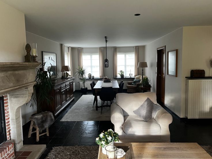 ruime woonkamer (42m2) met natuurstenen vloer en houtcassette.