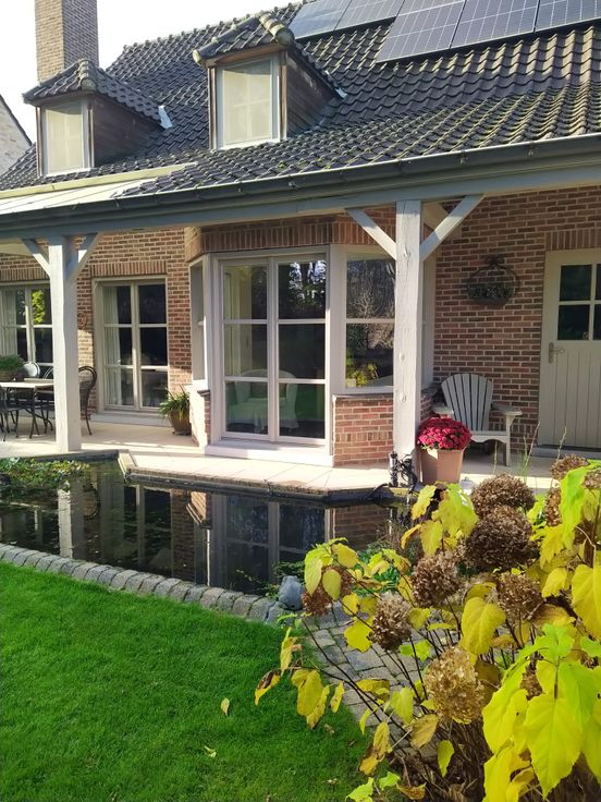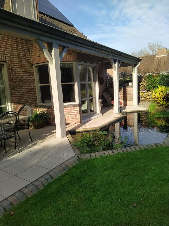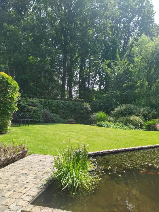 Aangelegde ZO gerichte tuin met vijver, bijgebouw (30m2) serre (15m2)