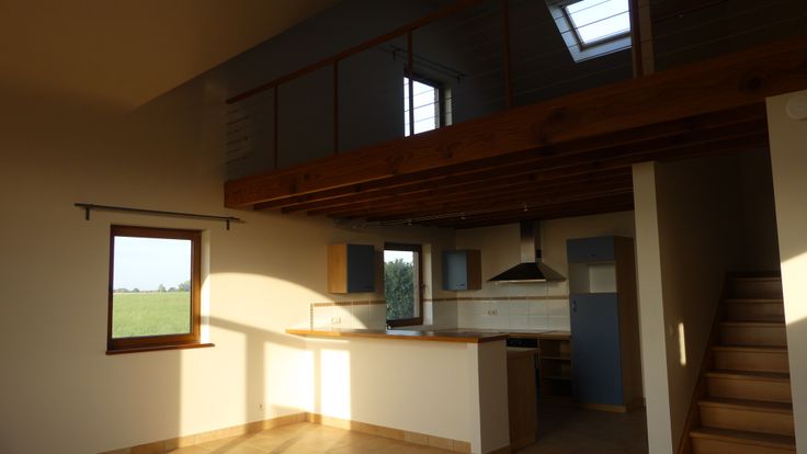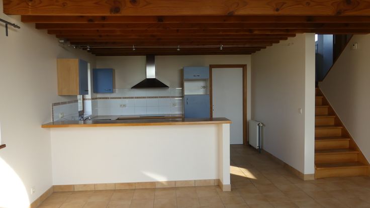 Grand salon en mezzanine, jolie cuisine américaine équipée, grande sdb meublée (avec raccordement pour machine à laver et séchoir), 1 grande chambre, petite pièce de rangement. Deux emplacements de parking et accès à un petit espace jardin.