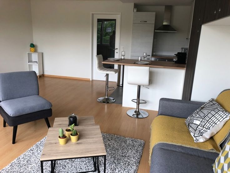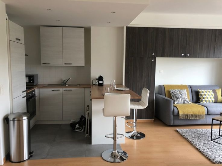 Ce flat très lumineux dispose d'un hall , salle de douches avec lavabo et WC , un beau et spacieux living très lumineux . Présence d'une cave .