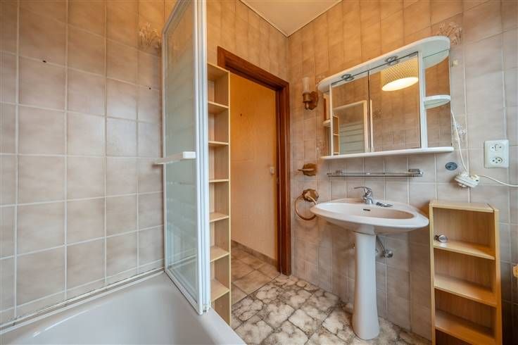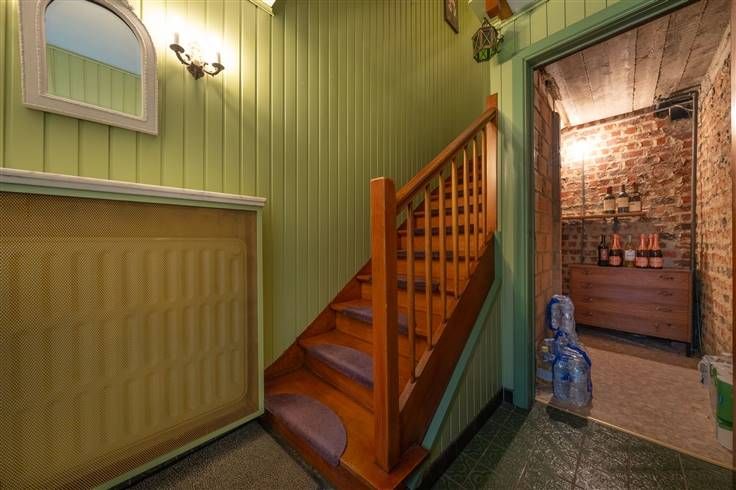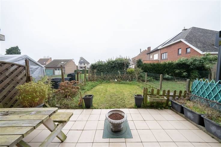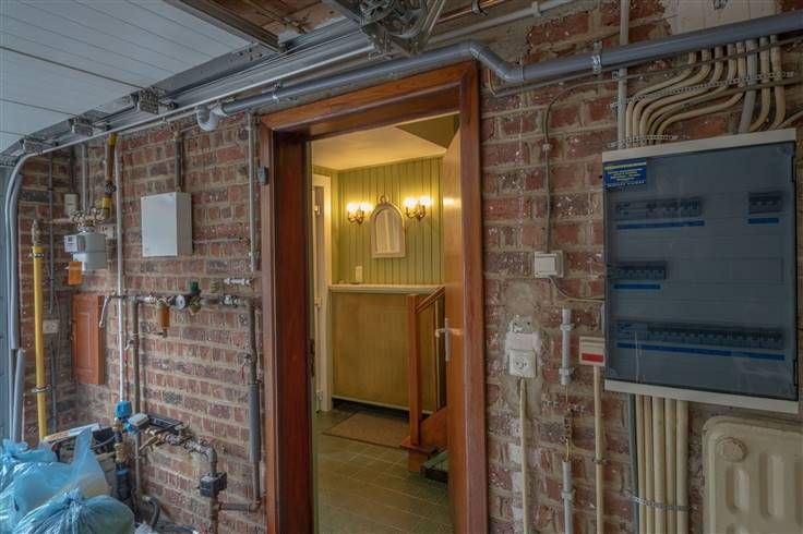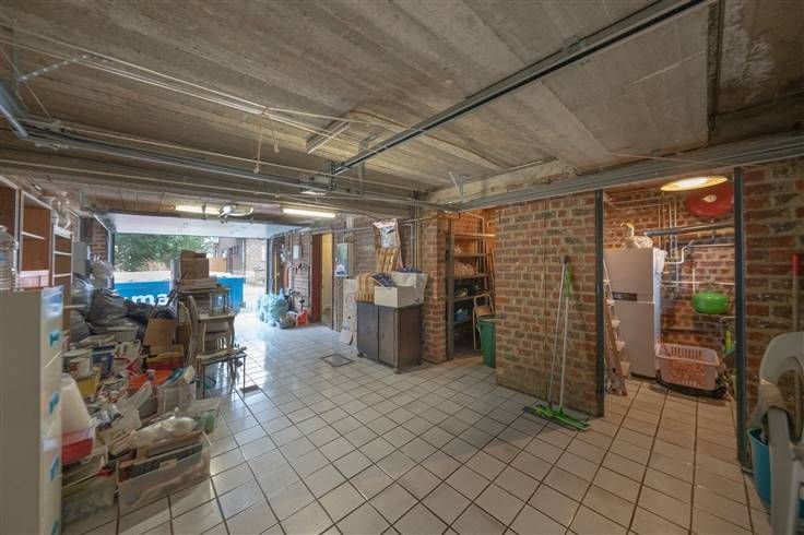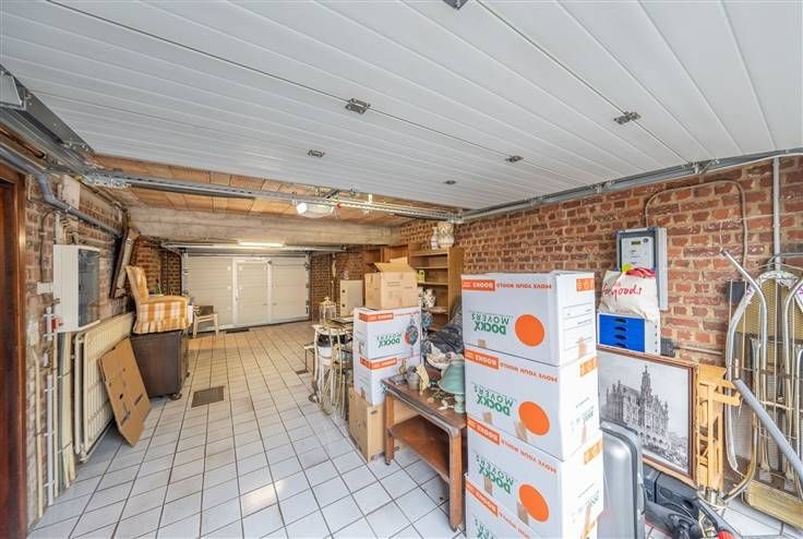 Gelijkvloers (54m2): inkomhall met de trap naar de eerste verdieping, provisiekeldertje, ruime garage (3m60x8m20), berging (1m60x1m95), stookplaats (1m60x1m95), terras en tuintje