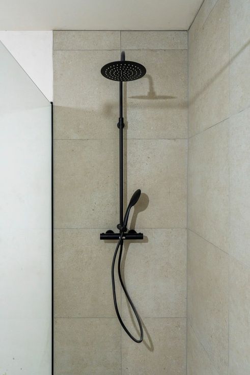 Badkamer met hoekbad, inloopdouche, dubbele lavabo en zwart kraanwerk.