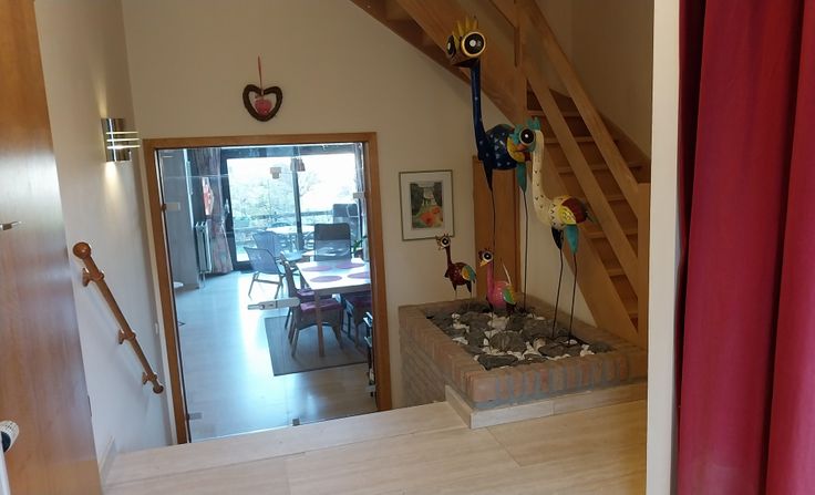 Au Rez-de-Chaussée, Garage 1 voiture + 2 emplacements parking devant la maison, Hall avec vestiaire, WC avec lave-main, Living spacieux, sol en marbre travertin menant à la terrasse et au jardin arboré, 2 stores solaires et citerne eau de pluie 2000 l, Cuisine équipée séparée avec son coin à déjeuner.