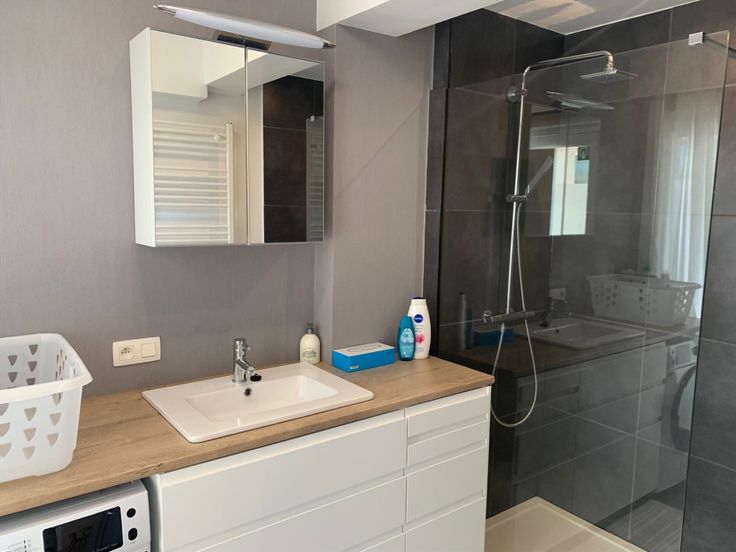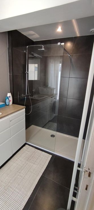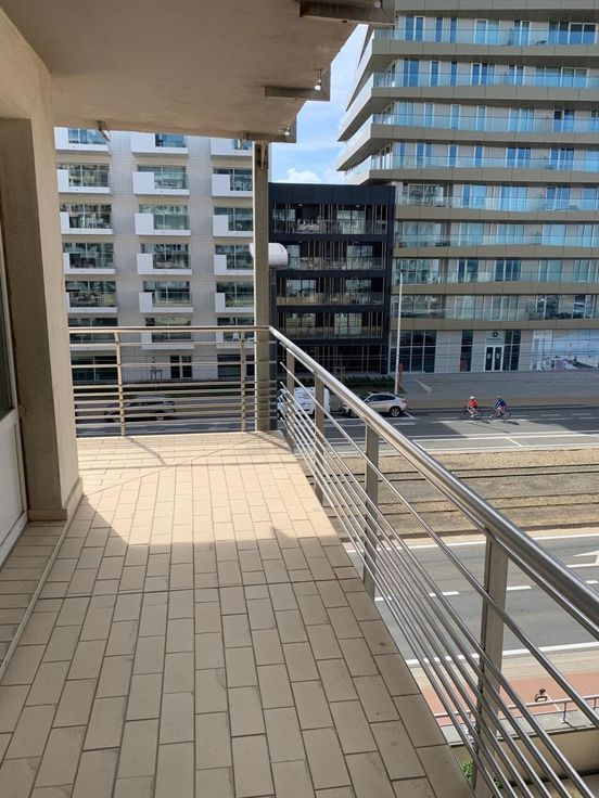 Woonkamer met open keuken (oven, microgolf, koelkast, vaatwas, ...), badkamer met instapdouche én wasmachine), aparte bergruimte, slaapkamer, toilet en L vormig terras.