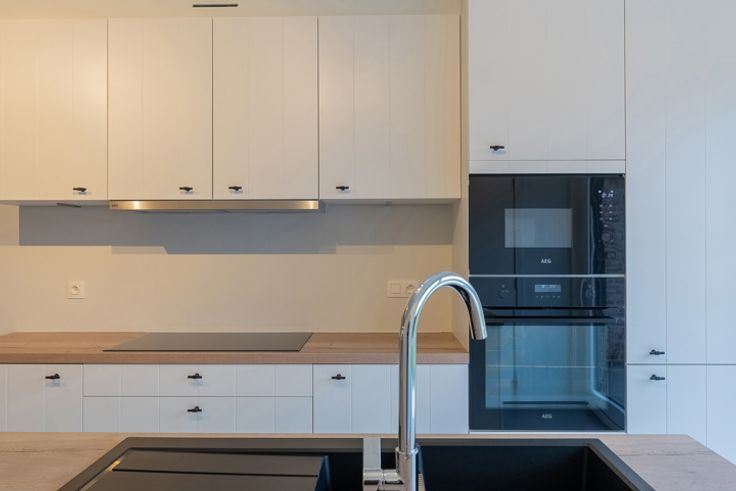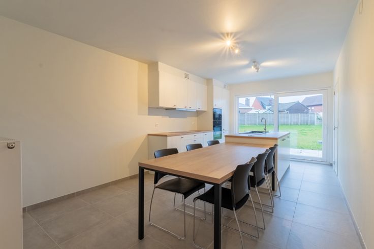 De lichtrijke woonkamer sluit naadloos aan op de open keuken, die volledig is uitgerust met hoogwaardige toestellen van AG, inclusief een vaatwasser en koelkast. Naast de keuken bevindt zich een handige bergruimte met aansluitingen voor een wasmachine en droogkast.
