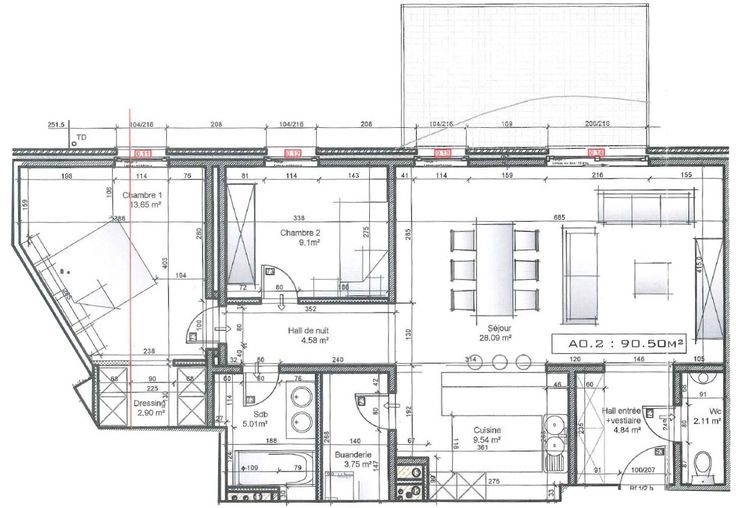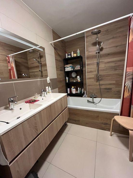 Hall de nuit, salle de bain (Meuble évier, baignoire), deux chambres à coucher.
