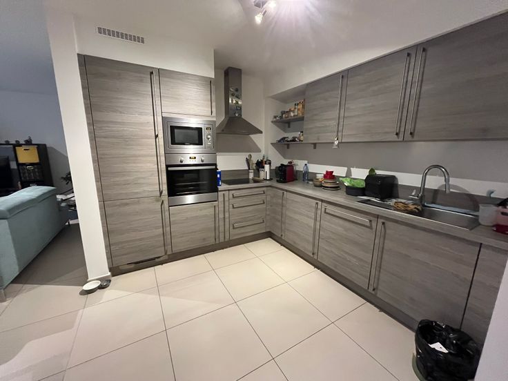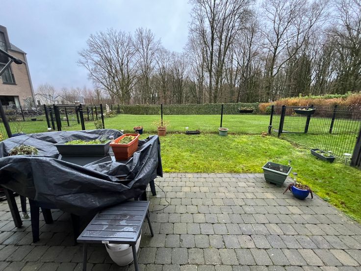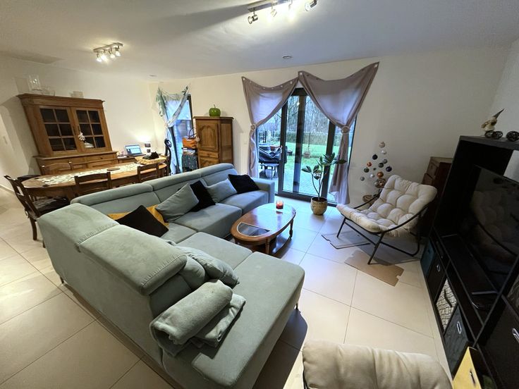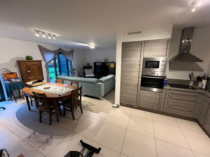 Hall d'entrée, WC séparé avec lave-mains, living donnant sur la terrasse et le jardin, cuisine ouverte (lave-vaisselle, frigo/congélateur, évier, four, hotte, taque vitrocéramique), buanderie (Pompe à chaleur, ventilation, raccordement machine à laver).