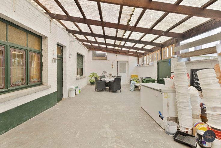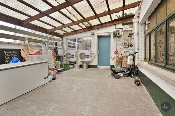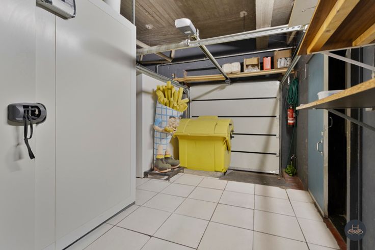 Het pand omvat een zeer grote ruimte vooraan het pand met toegang tot een kleinere berging. Daarnaast is er nog een zeer grote opslagplaats waar momenteel een koelcel staat. Deze opslagplaats is toegankelijk via een garagepoort van de straat. Dit biedt tal van mogelijkheden om goederen of dergelijke binnen te brengen.