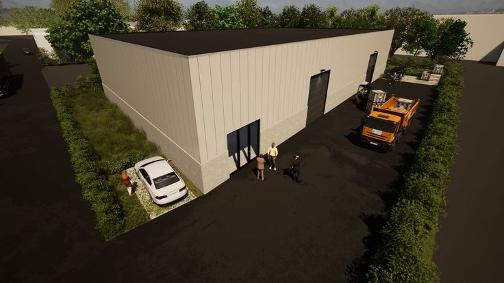 De nieuw te bouwen magazijnruimte met een vrije hoogte van +/- 6,60 meter wordt opgebouwd uit een staalconstructie in combinatie met een betonplint en geïsoleerde sandwichpanelen. De loods is toegankelijk via 2 automatische sectionale poorten (4,20 m B x 4,60 m H) en voorzien van 2 lichtstraten met rookluik. Aan de voorzijde is een glaspartij met toegangsdeur voorzien. Onsite zijn er 4 privatieve parkeerplaatsen. Plaatsen van zonnepanelen is mogelijk.