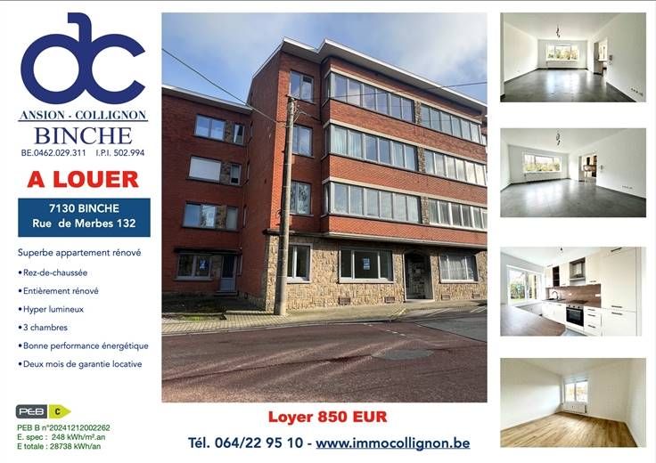 Sorry er is geen nederlandse vertaling beschikbaar. Binche, à louer, superbe appartement entièrement rénové, situé au rez-de-chaussée et comprenant :