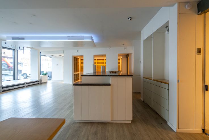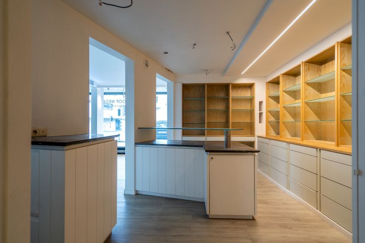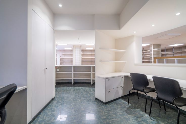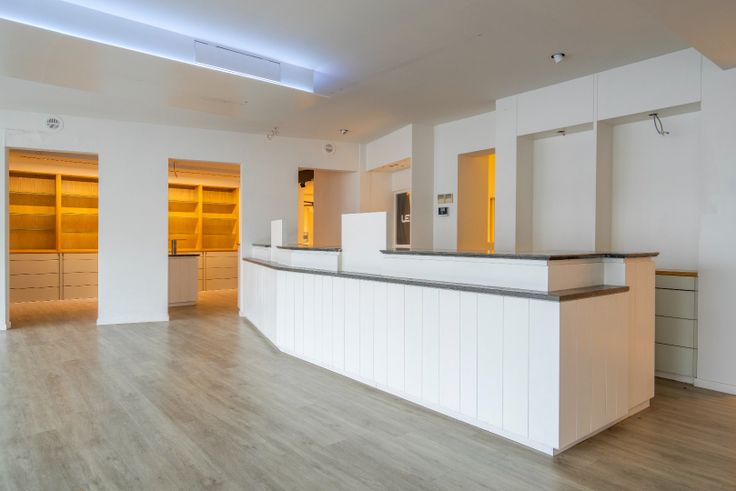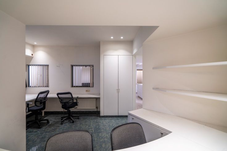 In het midden van het pand bevindt zich een praktische bureauruimte en een kitchenette, perfect voor administratieve taken of een korte pauze.