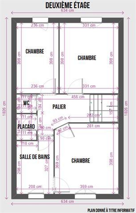 2°: palier, 3 chambres, salle de bains.
