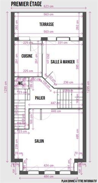 1°: palier, WC séparé, grand salon, salle à manger, cuisine, terrasse.