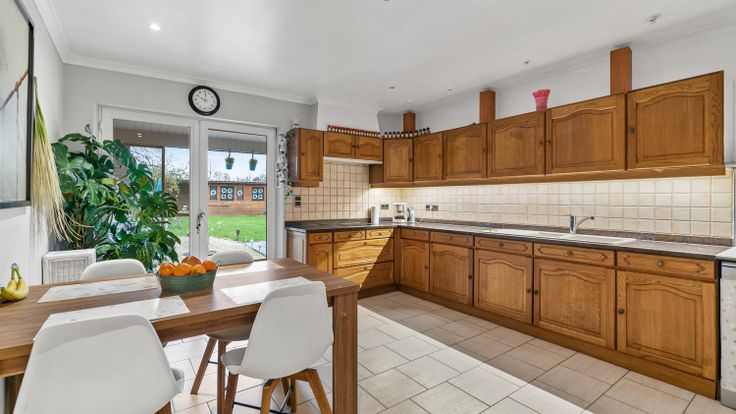 De ruime keuken biedt zicht op de tuin en beschikt over een terras, een graspartij en een praktische tuinberging.