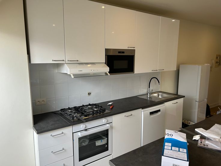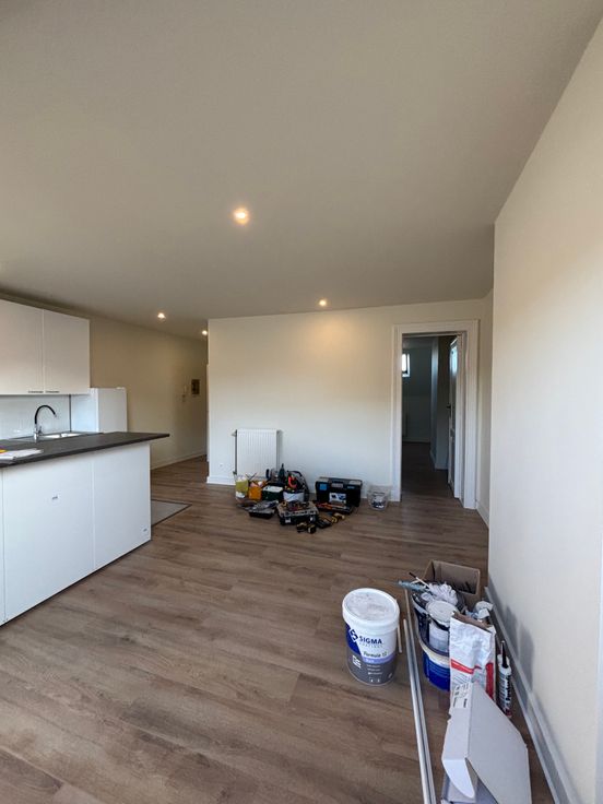 pièce de vie avec cuisine super équipée ouverte ,un bureau ou une chambre attenant au salon de 9 m2,une salle de bain de 8 m2 avec emplacement pour machine et a l'étage une chambre de 27m2 .
