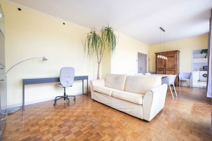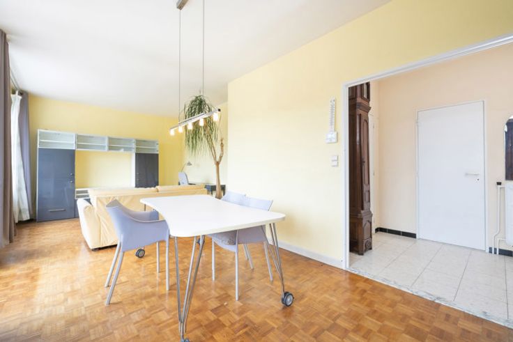 GANSHOREN, vlakbij het Château de Rivieren, op de 5de verdieping van een gebouw uit 1977, prachtige studio/penthouse van ± 70m². Het is als volgt samengesteld: hal, woonkamer van ± 29m² met parketvloer, dressing, douchekamer, ingerichte keuken, zuidgericht terras van ± 80m² en kelder. Alle oppervlaktes zijn indicatief. PEB : G, 113kg/ (m²/an). NIET TE MISSEN! TREVI NORD INFORMATIE: 02.410.10.30