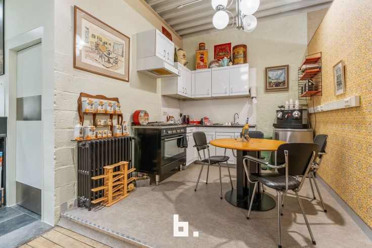 Op het gelijkvloers bevindt zich een ruime open magazijnruimte, waarin een volledig ingerichte keuken is geïntegreerd. Verder is er ook een garage op het gelijkvloers, die zowel kan dienen voor opslag als voor parkeergelegenheid.