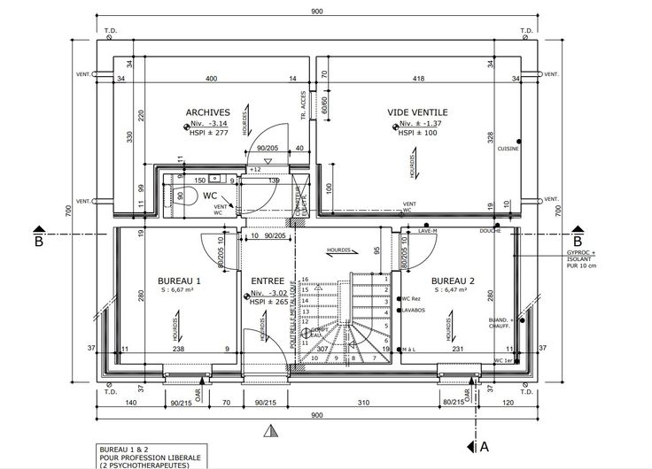 Sous-sol : Hall d’entrée qui donnera accès à 2 bureaux et un wc, une pièce pour les archives est également présente.