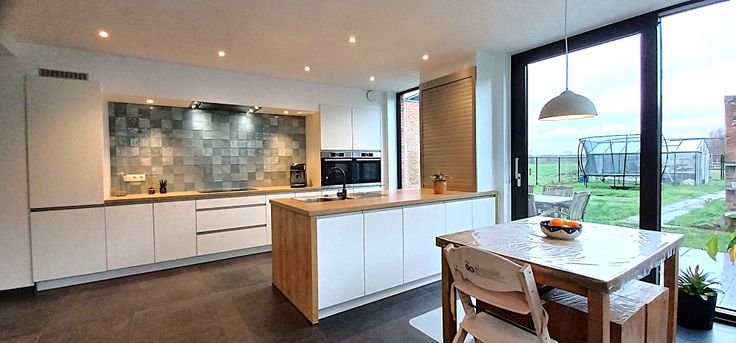 Gezellige woonkamer met inbouwhaard en maatkasten, loopt naadloos over in de ruime, hyper-geïnstalleerde leefkeuken met grote raampartijen (rechtstreekse toegang tot aangelegd terras en tuin) . Gastentoilet, berging en kelder.