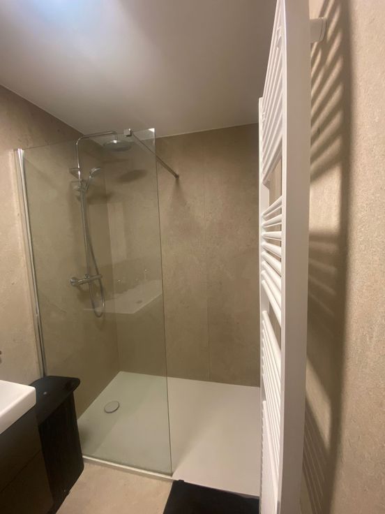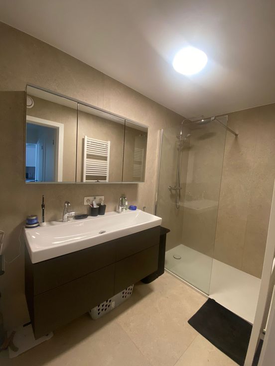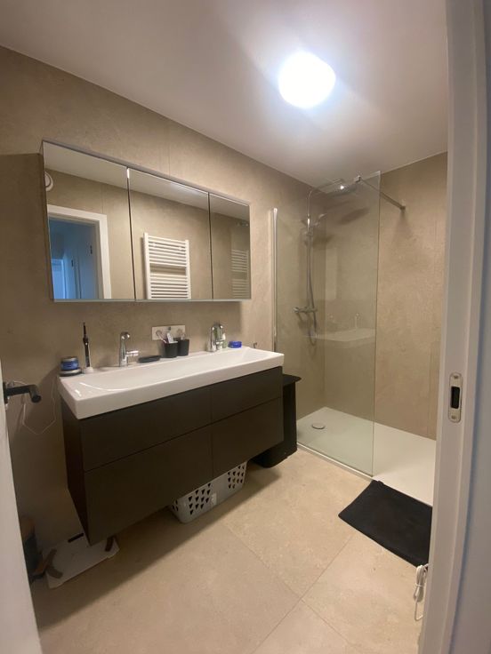 Stijlvolle badkamer met 2 lavabo's en een ruime inloopdouche.
