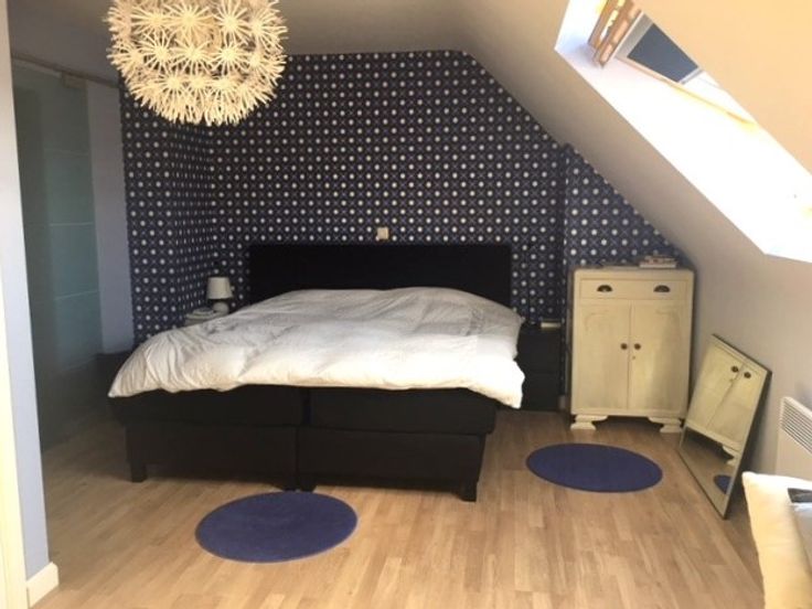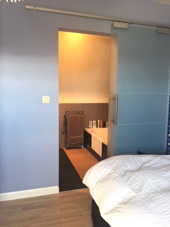 - Master slaapkamer met ensuite badkamer, uitgerust met ligbad en lavabo, afgesloten met een stijlvolle schuifdeur