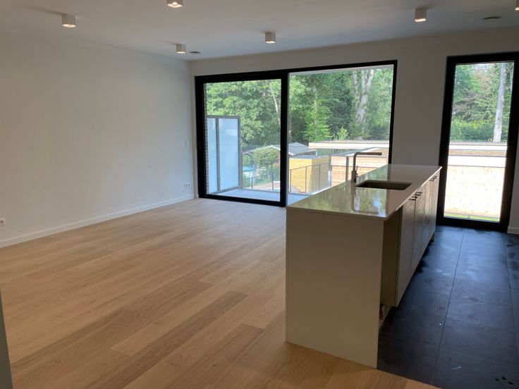 De grote glaspartijen achteraan geven uit op een voldoende ruim terras en bieden zicht op een groene omgeving. De moderne keuken is voorzien van alle hedendaags comfort: elektrische kookplaat, inbouwdampkap, grote ijskast, vaatwasser en combi-oven, allen van Miele. Naast de keuken bevindt zich een aparte berging met ruimte voor wasmachine, droogkast, voorraad etc. Verder zijn er 2 slaapkamers, ook beiden op parketvloer. De badkamer is voorzien van een mooie inloopdouche, dubbel lavabomeubel en toilet. Ook is er een apart gastentoilet.