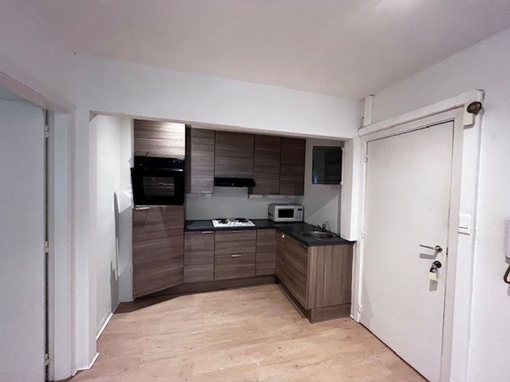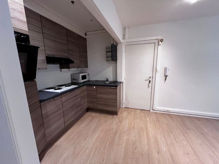Living met open ingerichte keuken, badkamer met douche en toilet en één slaapkamer. Extra kamer met lavabo en toilet op de gang. (zelfde verdieping) Overal laminaatparket.