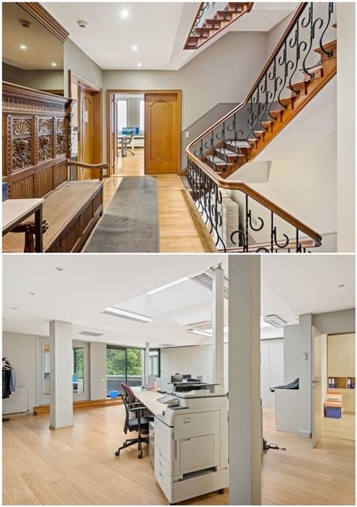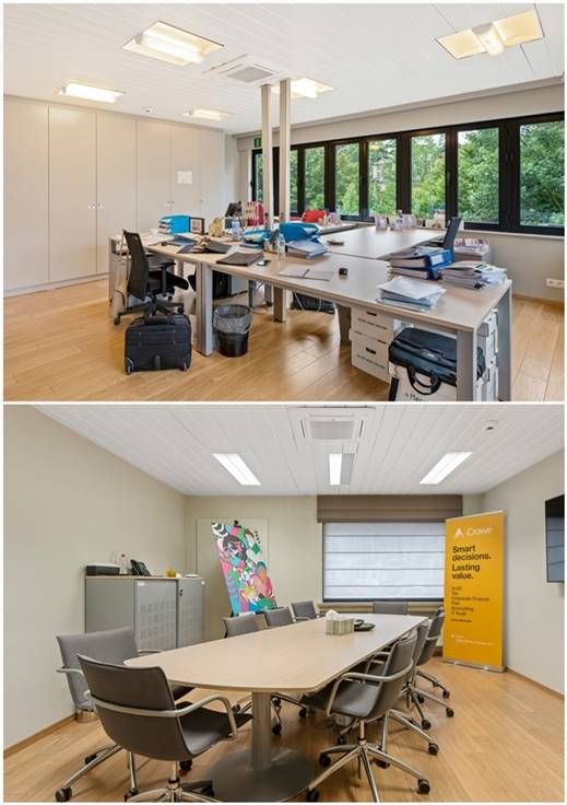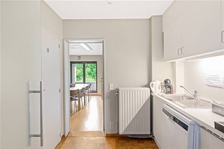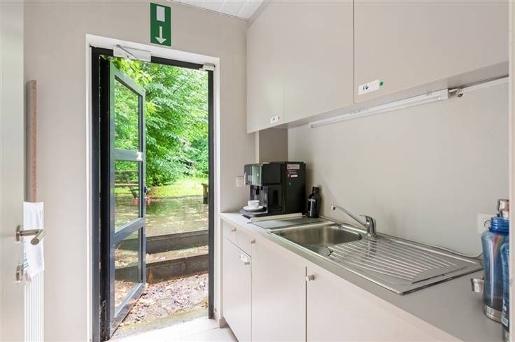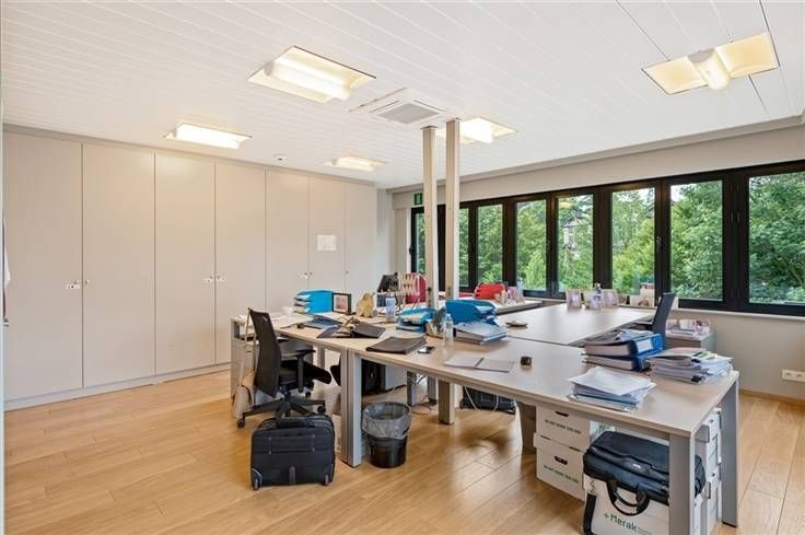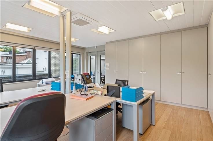 Het kantoor beschikt achteraan over verschillende terrassen met uitzicht op de tuin, er is eveneens een daktuin aanwezig.