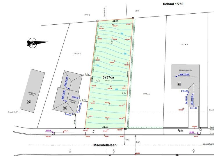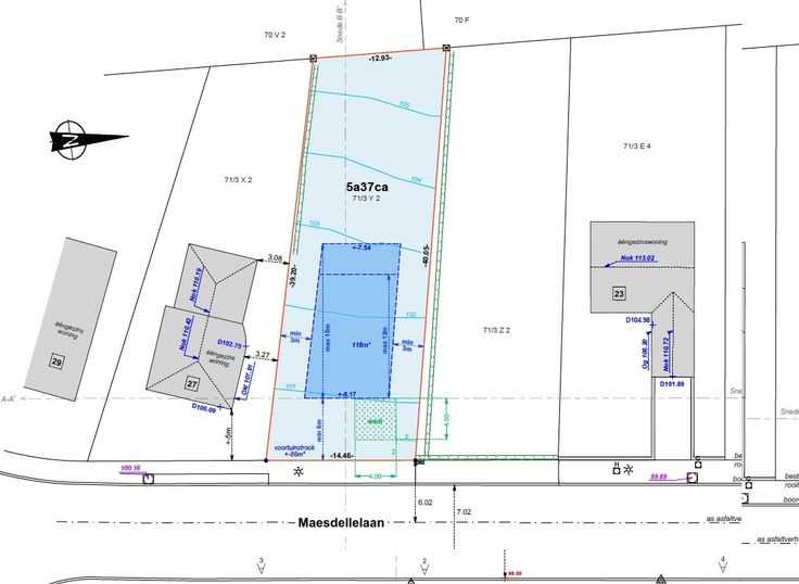 De bouwgrond is geschikt voor een open bebouwing, bouwzone van 118m² op het gelijkvloers en 95m² op het verdiep. Toegestane constructie : Bouwdiepte gelijkvloers 15m, bouwdiepte verdiep 12m (of zowel gelijkvloers als verdiep 13m diepte). Bouwvrije strook van 3m langs de perceelsgrens.