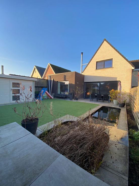 In de quasi onderhoudsvrije tuin met oostelijke oriëntatie is er een sfeervolle vijver, een tuinhuisje en een groot terras voorzien.