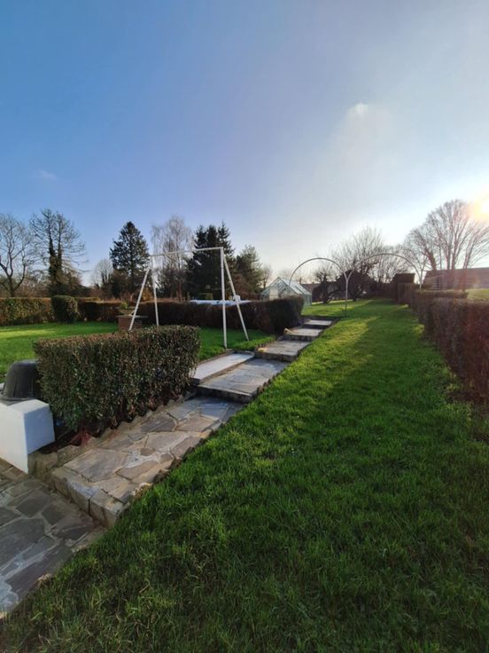 Vaste jardin avec serre.