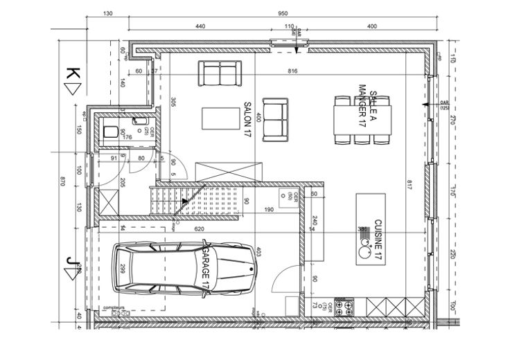 Rez-de-chaussée : hall d'entrée, WC séparé avec lave-mains, séjour avec cuisine équipée ouverte, garage avec coin buanderie, place de parking, fondation de terrasse prête et jardin non engazonné