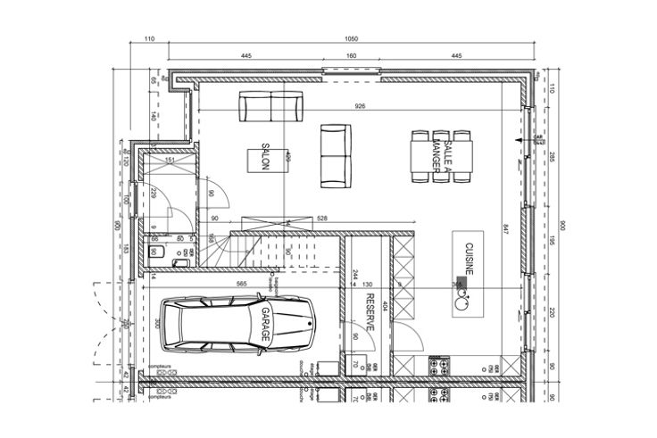 Rez-de-chaussée : hall d'entrée, WC séparé avec lave-mains, séjour avec cuisine équipée ouverte, réserve, garage, place de parking, fondation de terrasse prête et jardin non engazonné