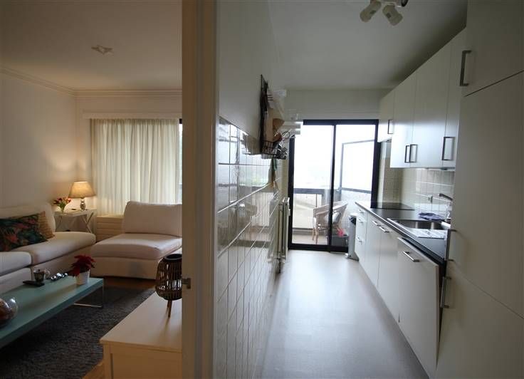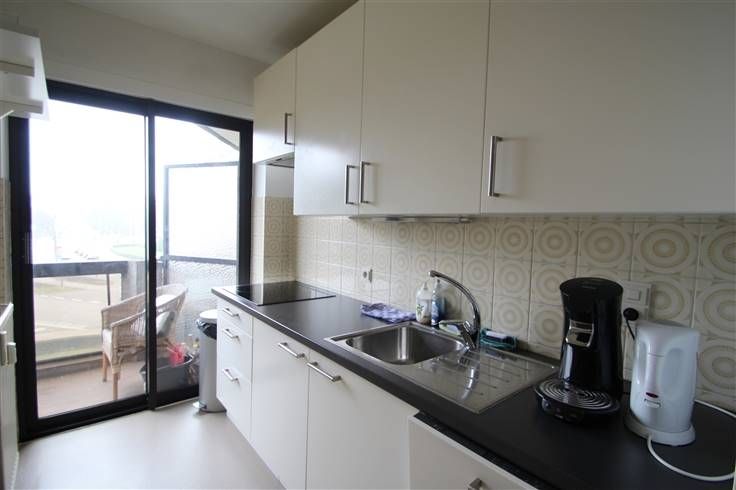 Keuken met alle nodige toestellen, aparte opbergruimte en toegang tot het terras.