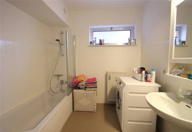 Badkamer met ligbad, lavabo en aansluiting voor de wasmachine.