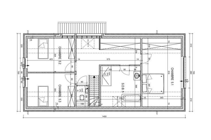 Etage : 3 chambres, salle de bain avec baignoire, douche, meuble vasque, miroir, WC séparé avec lave-mains et grenier accessible par une trappe